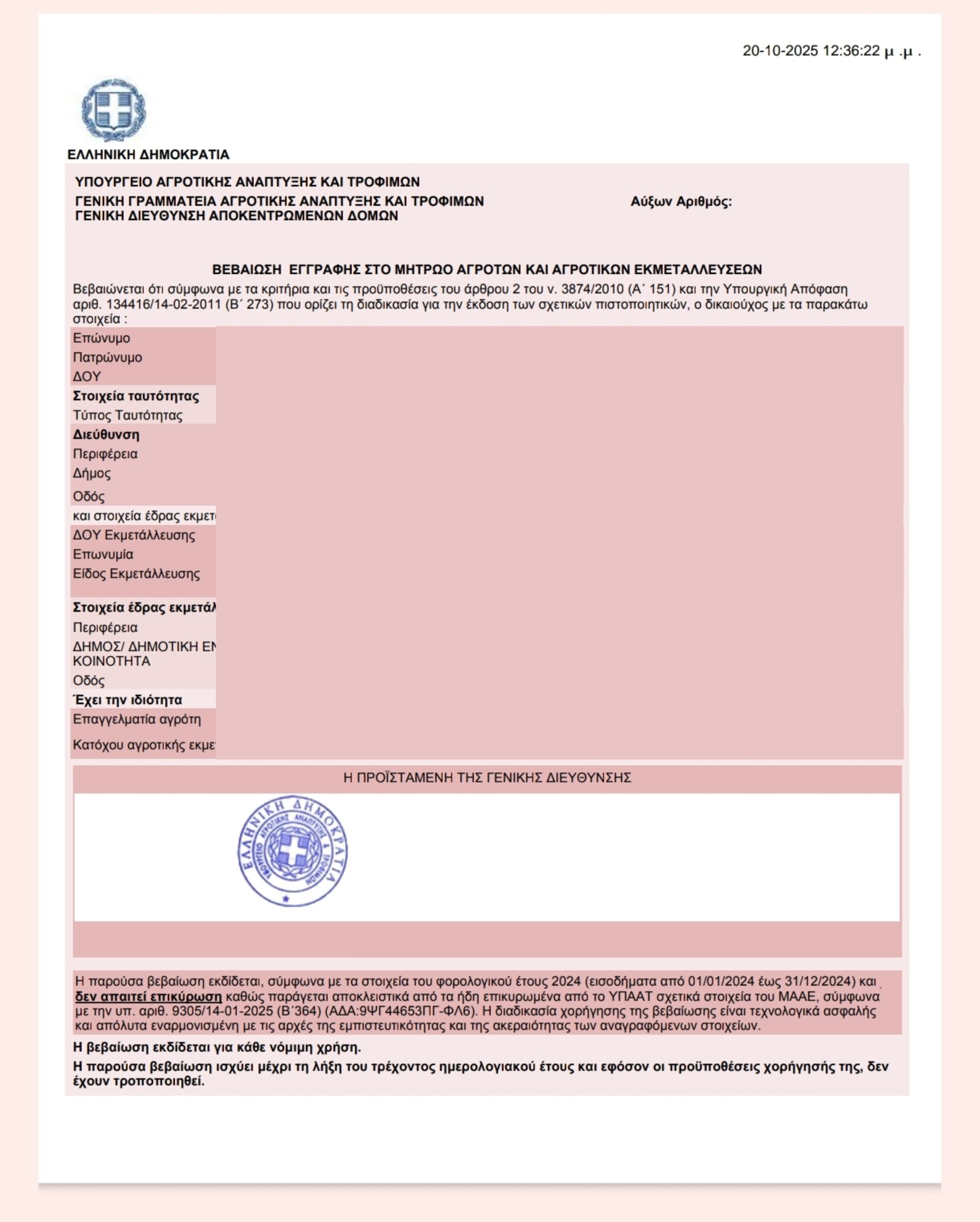 Για την είσοδο στο γήπεδο, οι ενδιαφερόμενοι αγρότες θα πρέπει να επιδείξουν τη σχετική βεβαίωση ΜΑΑΕ (Μητρώο Αγροτων και Αγροτικών Εκμεταλλευσεων) στα εκδοτήρια, όπως στο παράδειγμα που ακολουθεί.