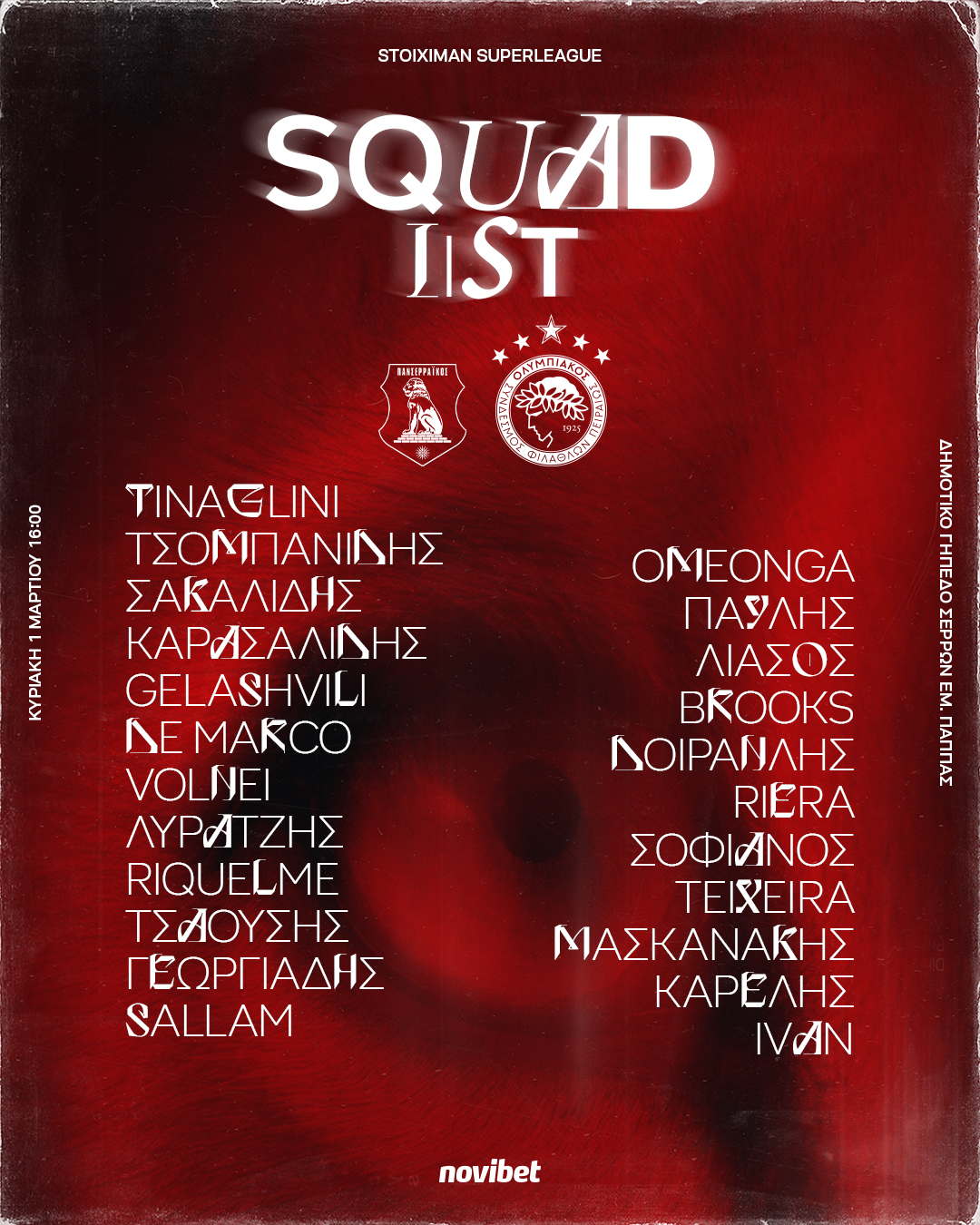 Εκτός αποστολής έμειναν ο τιμωρημένος Ίβαν, οι τραυματίες Αρμουγκόμ και Ουαγκέ και οι Μαρίνος, Παυλής, Πουρλιοτόπουλος, Ρουμιάντσεβ.
